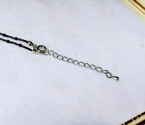 その美しい煌めきが映えるよう、周りは黒の竹ビーズと丸ビーズを組み合わせて首周りを装飾。