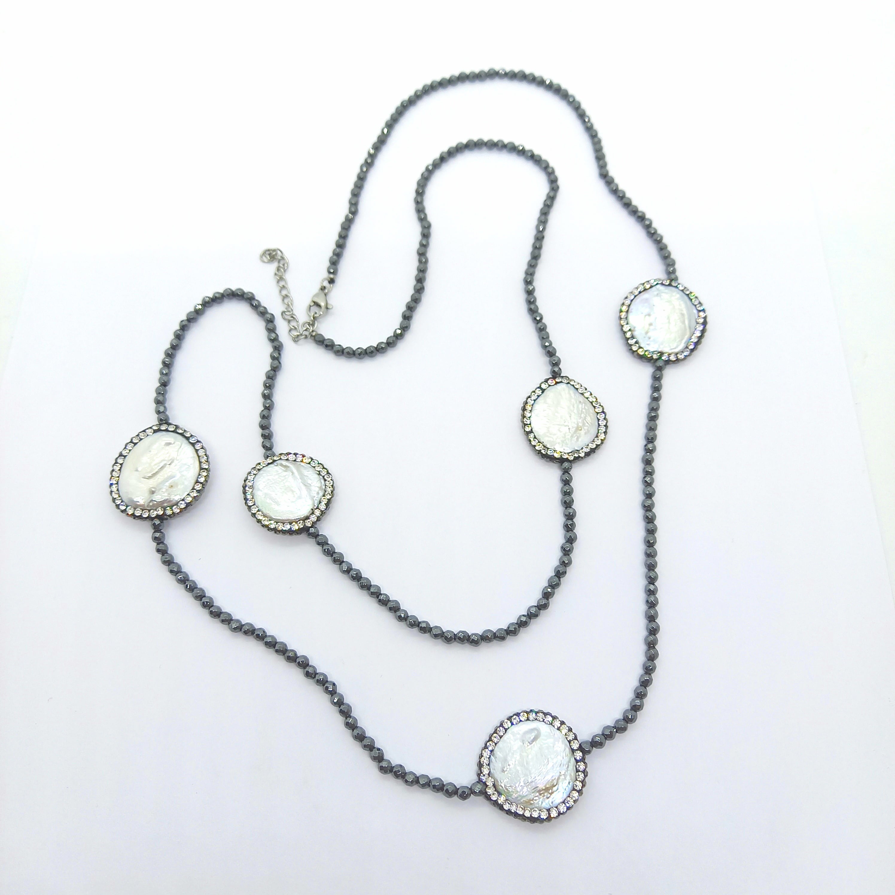 バロック型の大粒淡水パールと、カットの入ったブラックスピネルを散りばめた、個性的で美しいネックレスです。